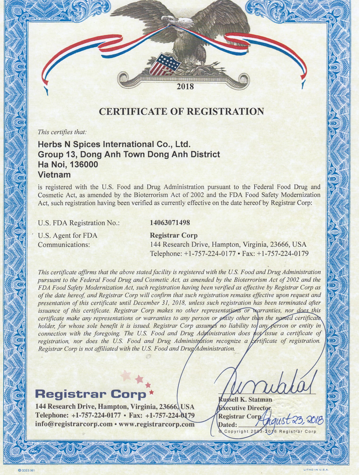 Our food safety systems are certified by the U.S. Food and Drug Administration pursuant to the Federal Food Drug Cosmetic Act.